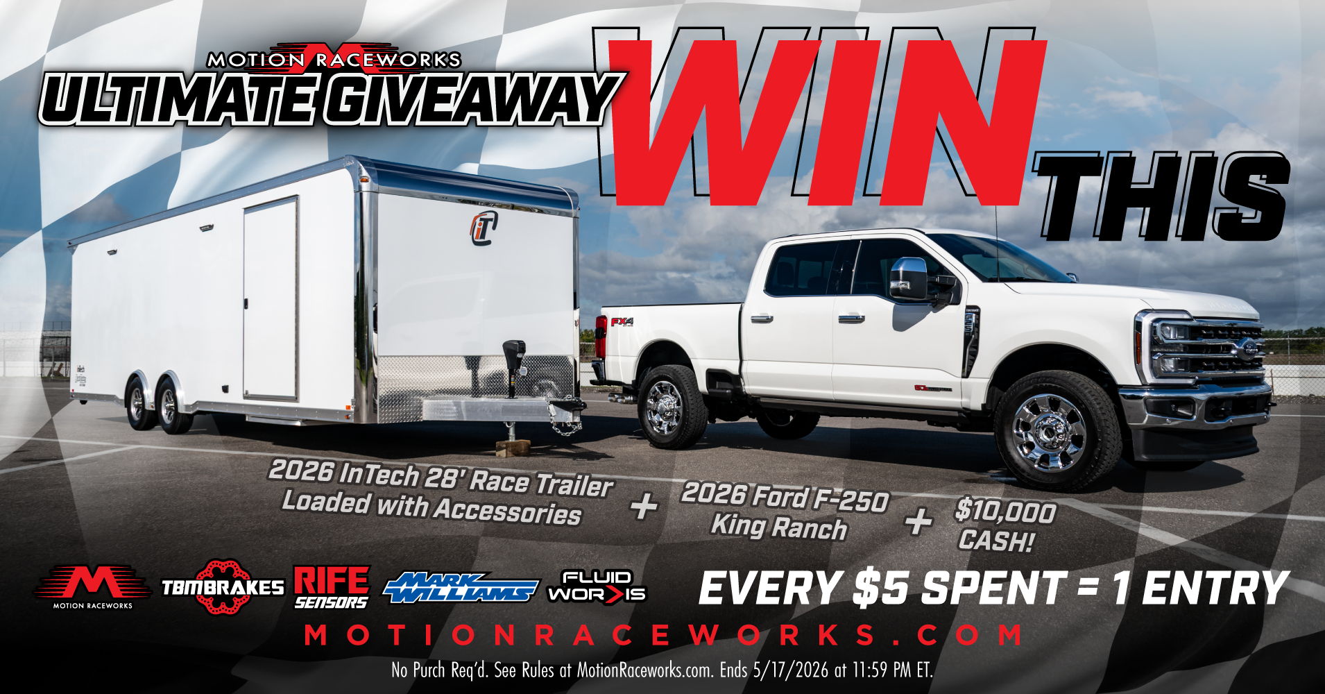 You could win this Ultimate towing package including a 2026 F250 King Ranch and matching 2026 28 foot INtech aluminum race trailer, PLUS $10,000 cash by shopping at MotionRaceworks.com, TBMBrakes.com, or MarkWilliams.com